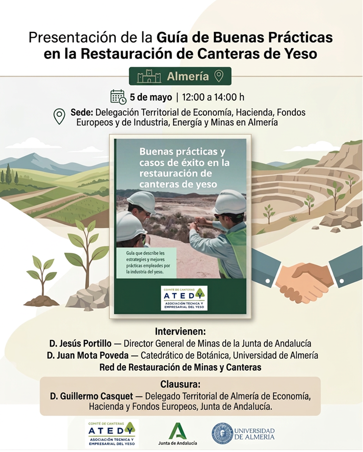 La Asociación Técnica y Empresarial del Yeso (ATEDY) celebrará el próximo martes 5 de mayo, de 12:00 a 14:00 horas, una Jornada de presentación de la Guía de Buenas Prácticas en la Restauración de Canteras de Yeso en Almería. El encuentro tendrá lugar en la Delegación Territorial de Economía, Hacienda, Fondos Europeos y de Industria, Energía y Minas en Almería, ubicada en Plaza Juan del Águila Molina, 5 (Plaza Barcelona).
